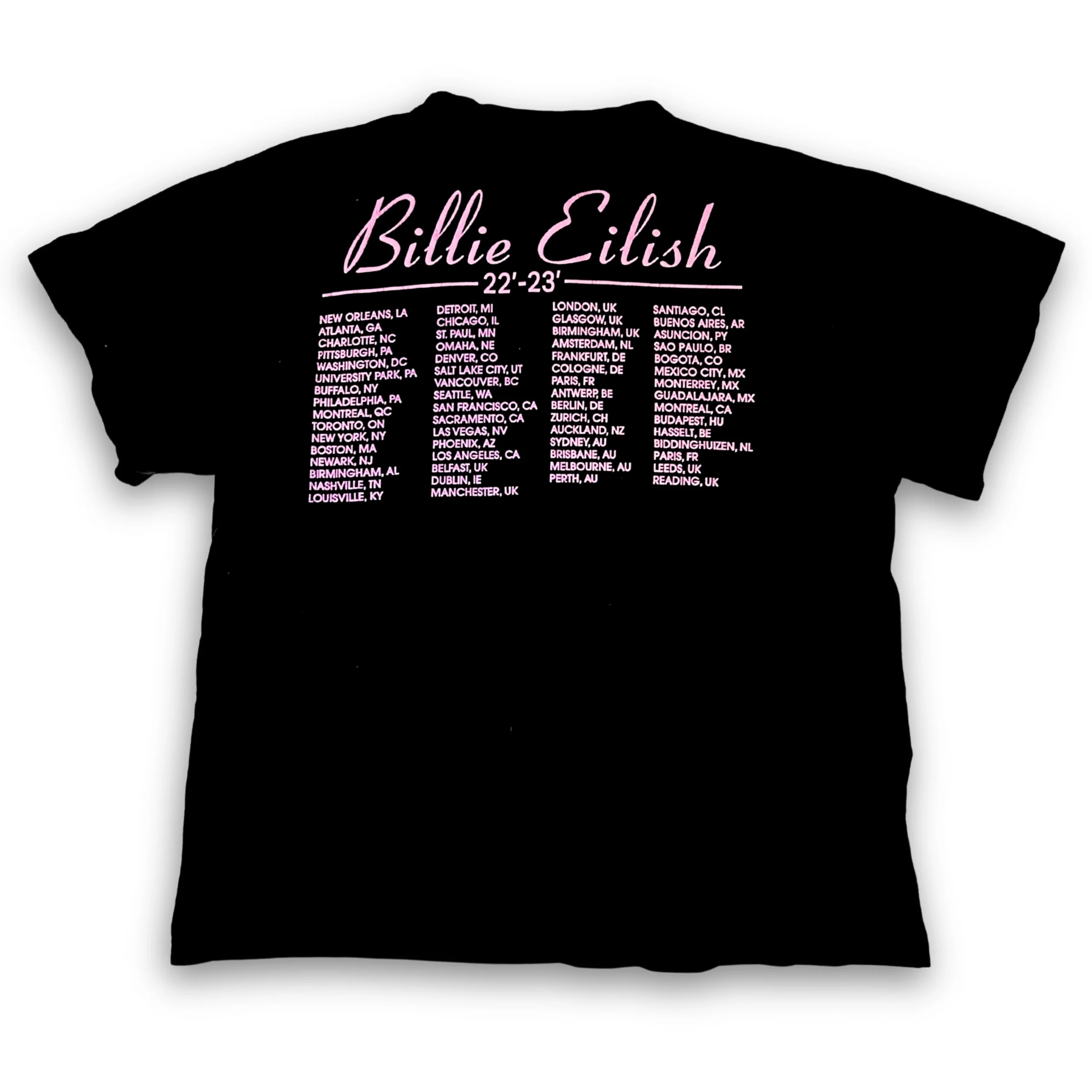 La parte trasera de la camiseta rinde homenaje a las ciudades mexicanas que formaron parte del tour: CDMX, Guadalajara y Monterrey. Su diseño captura la esencia de estos eventos tan significativos para los seguidores de Billie en México.