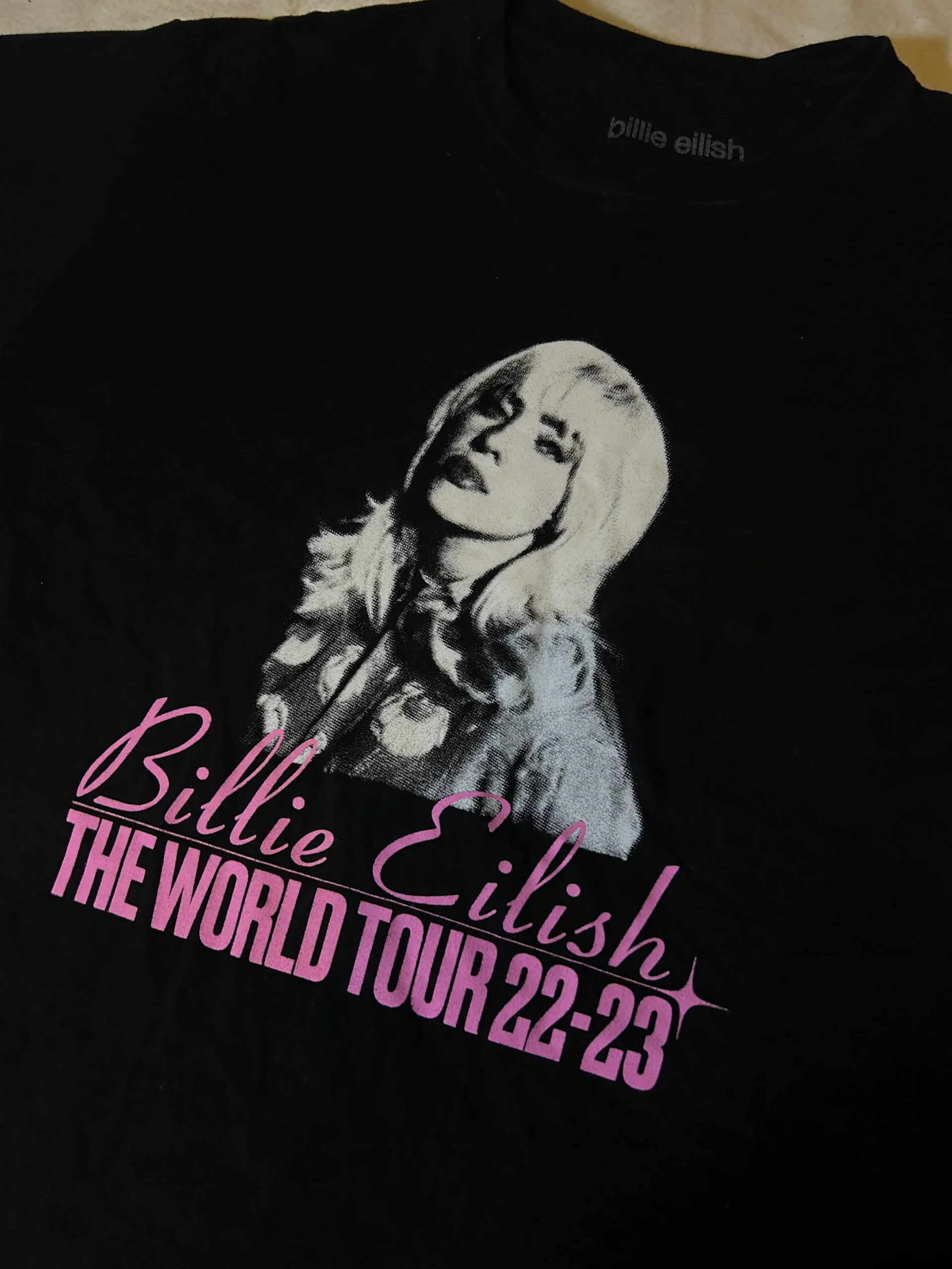 Esta camiseta oversize en talla S, con ajuste amplio que funciona perfecta para tallas M-L, es un artículo único. Fue diseñada exclusivamente para los conciertos de Billie Eilish en México como parte de su icónico tour Happier Than Ever 2023.