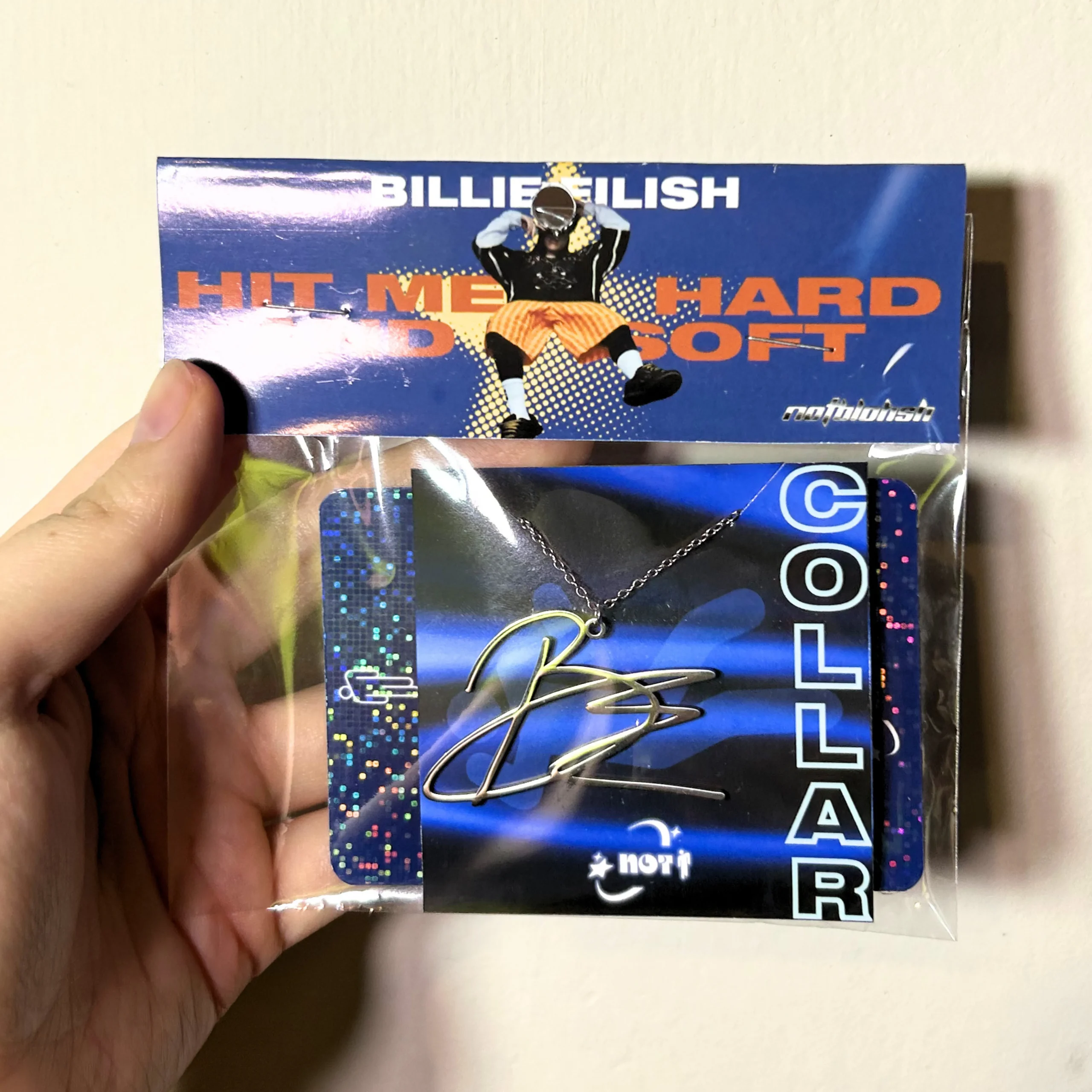 ⭐️Fabricado con acero inoxidable de alta calidad, este collar cuenta con una cadena de 45 cms que garantiza durabilidad y comodidad. Además, cada pedido incluye una photocard random de Billie, haciéndolo aún más especial para los fans. ¡Un artículo imperdible para cualquier colección!