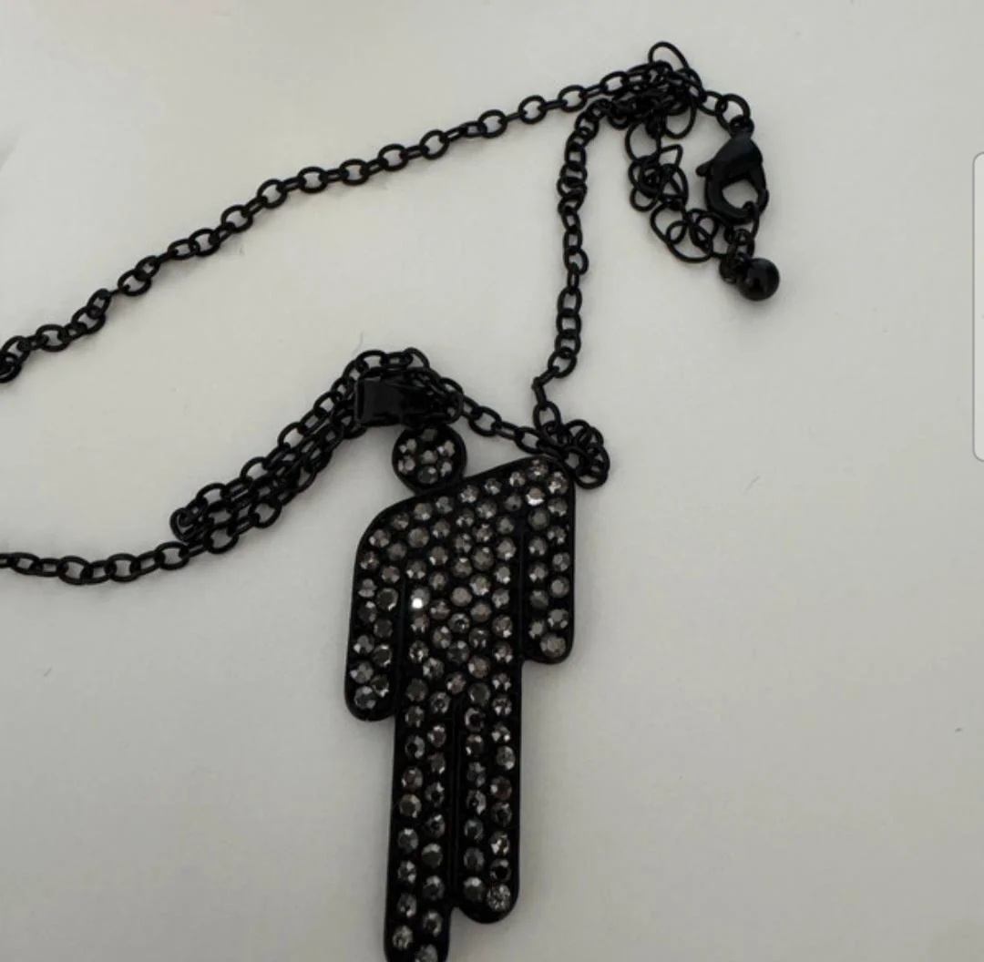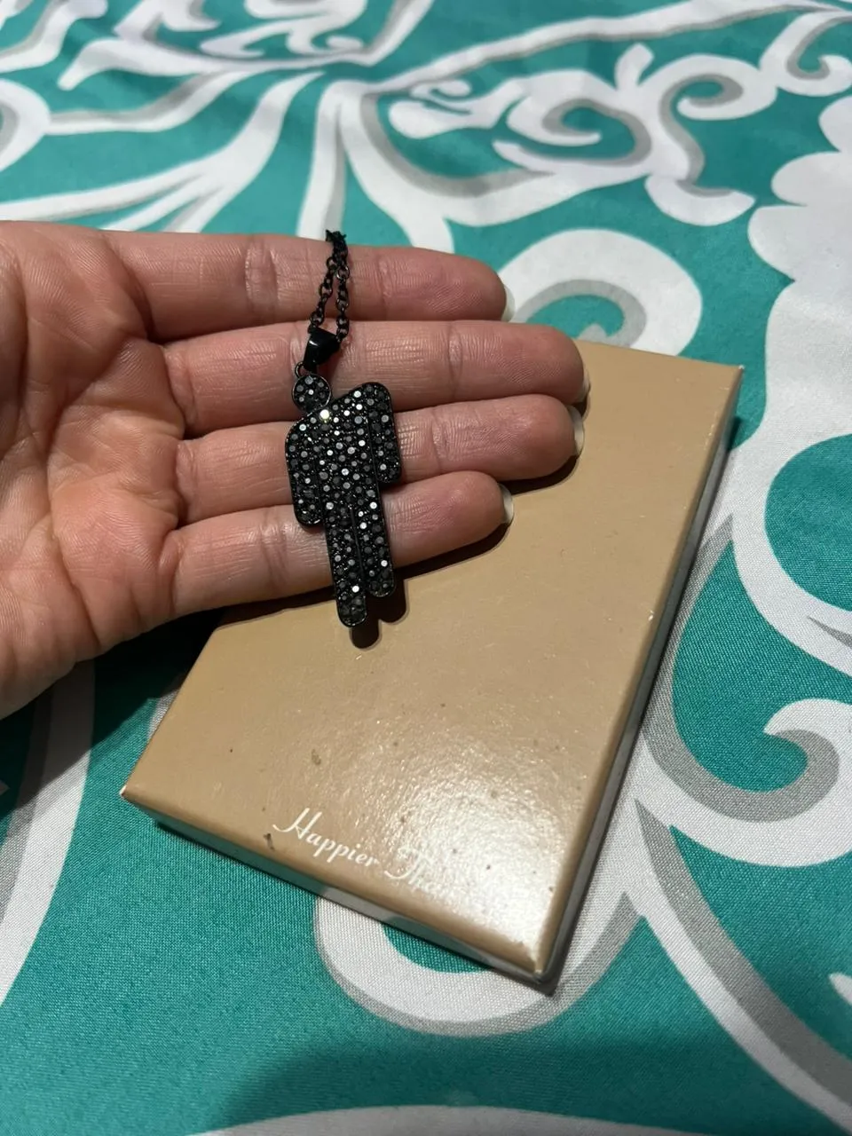 Este es el collar negro Blohsh original, lanzado por primera vez en la tienda online oficial de Billie Eilish durante la icónica era de «Happier Than Ever». A diferencia de las versiones modernas, más pequeñas y de menor calidad que se venden actualmente en su sitio web, esta pieza destaca como un artículo de colección raro e invaluable.